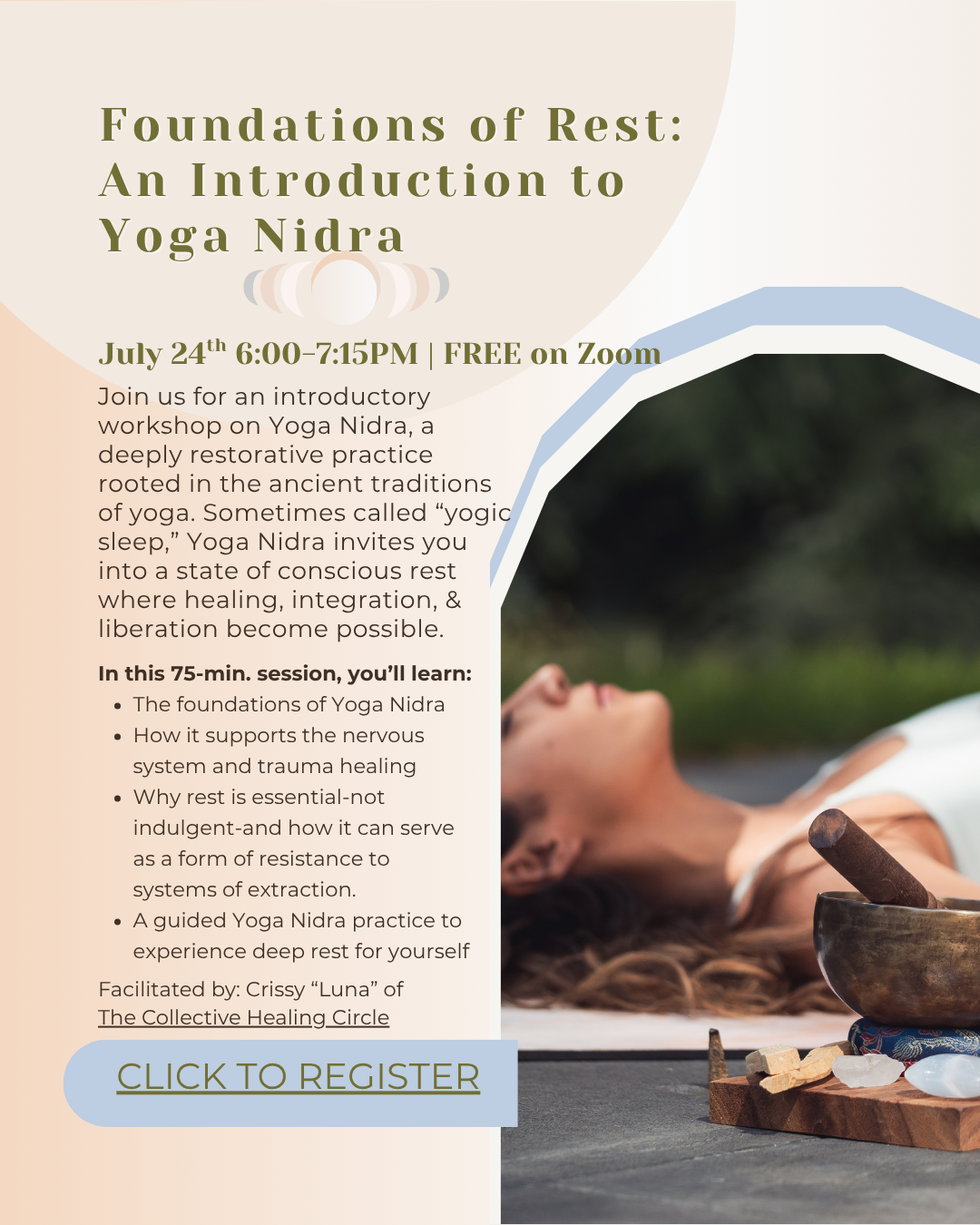 Foundations of Rest: An Introduction to Yoga Nidra Click here to go back to Events page Reserve your Spot today!